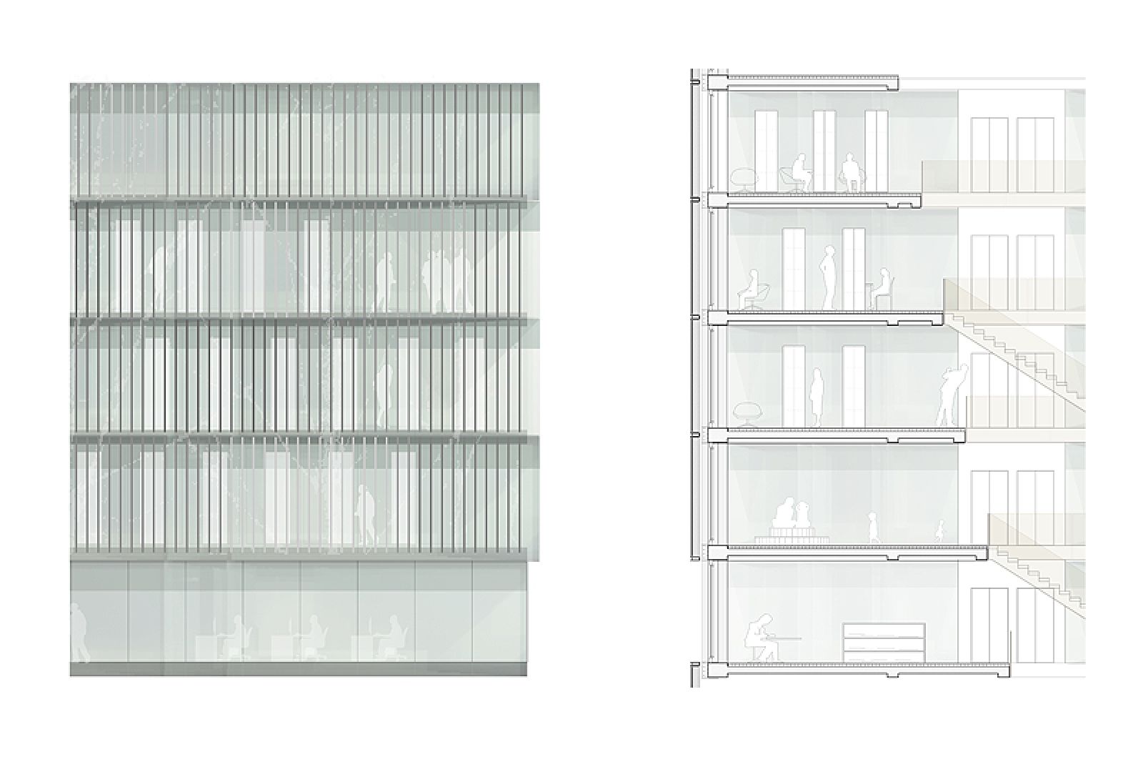 Im Inneren des Gebäudes gibt es einen einzigen, zusammenhängenden Innenraum, ein Raum-Kontinuum, mit verschiedenen Ebenen. Die ihre eigene Identität haben. Die Besucher können frei wählen, wo sie sich aufhalten und arbeiten möchten. Der zentrale Freiraum spiegelt diesen Prozess wider und als Erschließung verteilt die Menschen vertikal in das Gebäude.