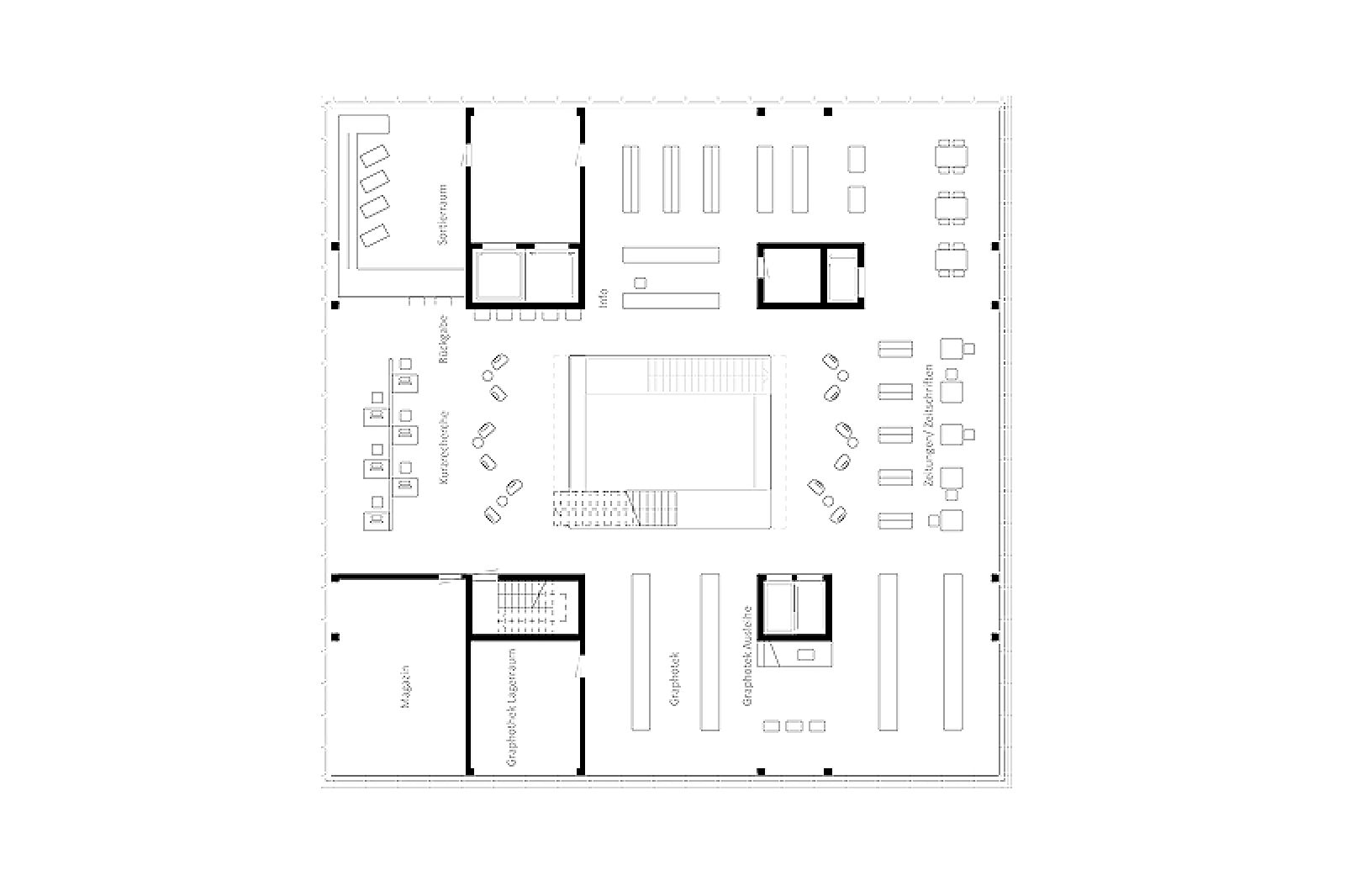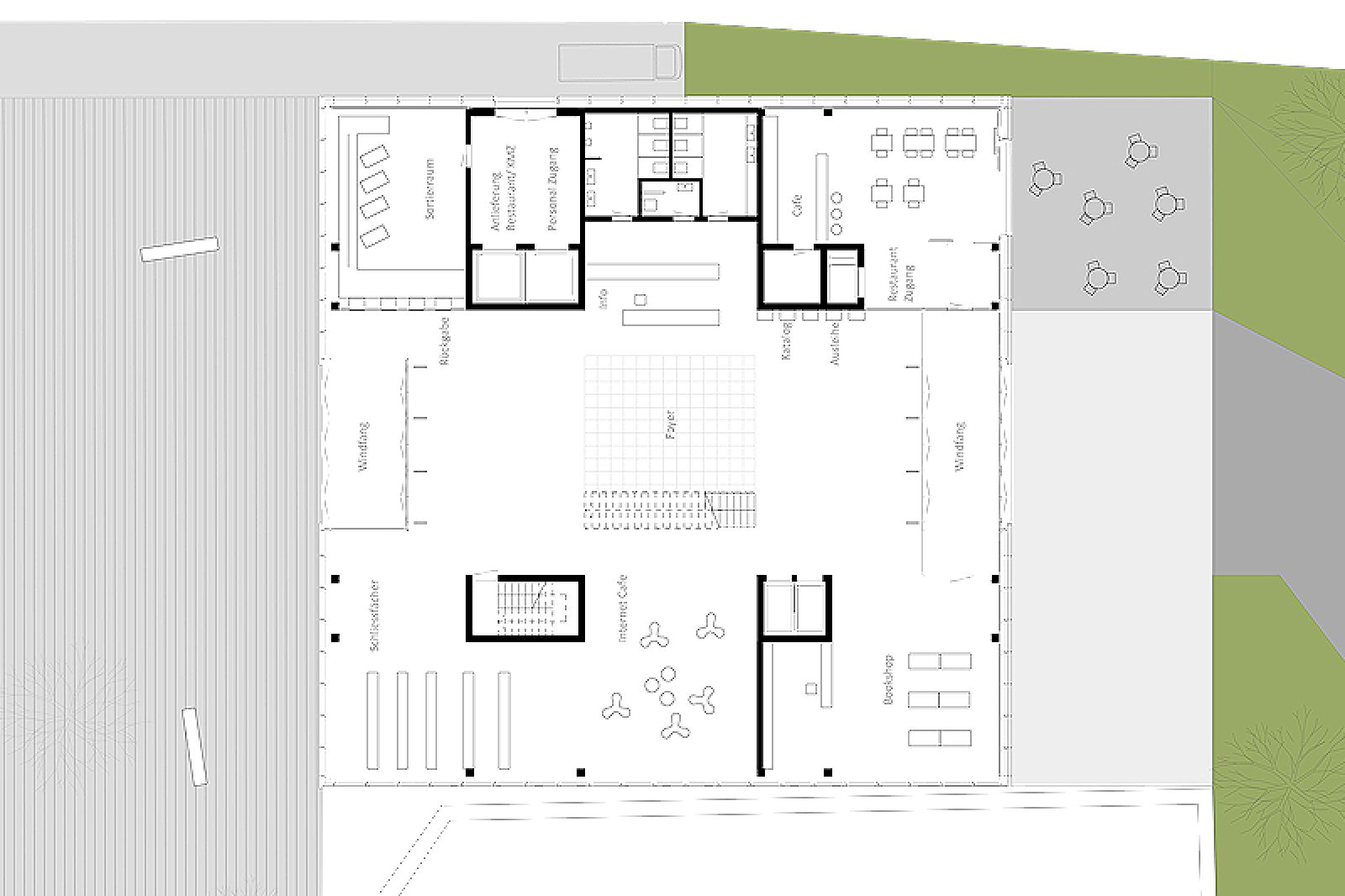 Die beiden Fußgängerachsen, die Ost-West-Achse und die Nord-Süd-Verbindung vom Hauptbahnhof zur Pauluskirche, werden durch die Bibliothek miteinander verbunden. In der unmittelbaren Nähe der Bibliothek entstehen zwei neue Plätze, die den Stadtraum aktivieren und die Verbindung zwischen den beiden Fußgängerachsen stärken. Die beiden Nord und Süd-Seiten des Gebäudes sollen zu öffentlichen Aufenthaltsorten werden und das Publikum in die Bibliothek einladen.
