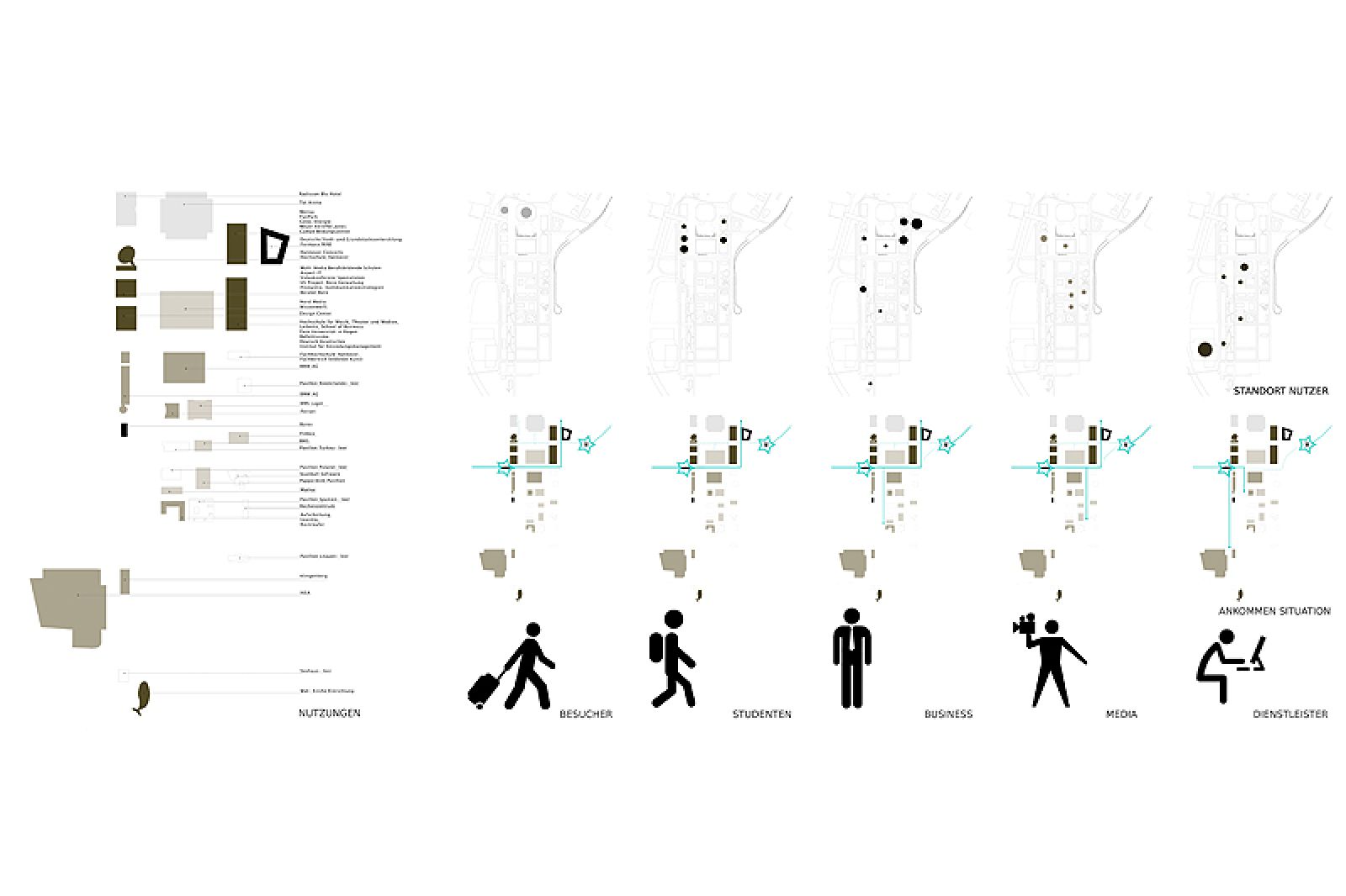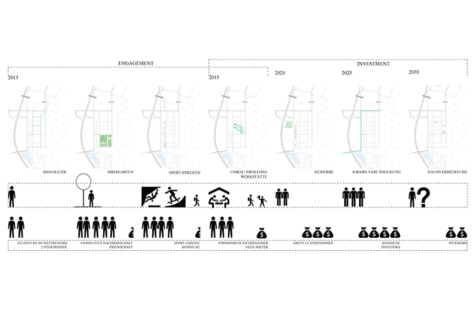 Das Konzept besteht darin, städtebauliche Strategien und Szenarien für die Transformation und Weiterentwicklung des ehemaligen Expo-Areals zu entwickeln. Durch eine Analyse der vorhandenen Akteure auf unterschiedlichsten Betrachtungsebenen wurden Ideen generiert, um mögliche Nutzer auf das Gelände zu bringen. Sie bilden verschiedene Nutzungscluster, die unterschiedlichen Wirkungsradien entsprechen. Das Pavillongelände bietet Platz für neue Aktivitäten, die zunächst keine große Investition erfordern. Die leerstehenden Pavillons werden durch temporäre Nutzungen aktiviert und im Süden des Geländes wird den Bürgern der Stadt Hannover ein Obstgarten zur Verfügung gestellt. Diese neuen Nutzungen sollen Einnahmen ermöglichen, um weitere Entwicklungen auf höherer Ebene zu realisieren, wie z.B. die Verlängerung der Stadtbahnlinie.
