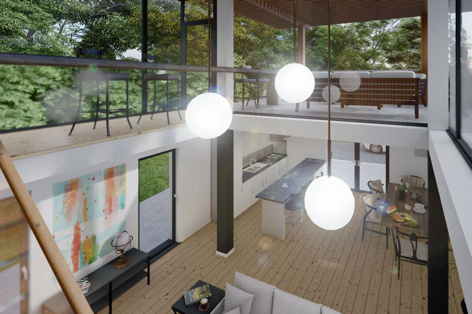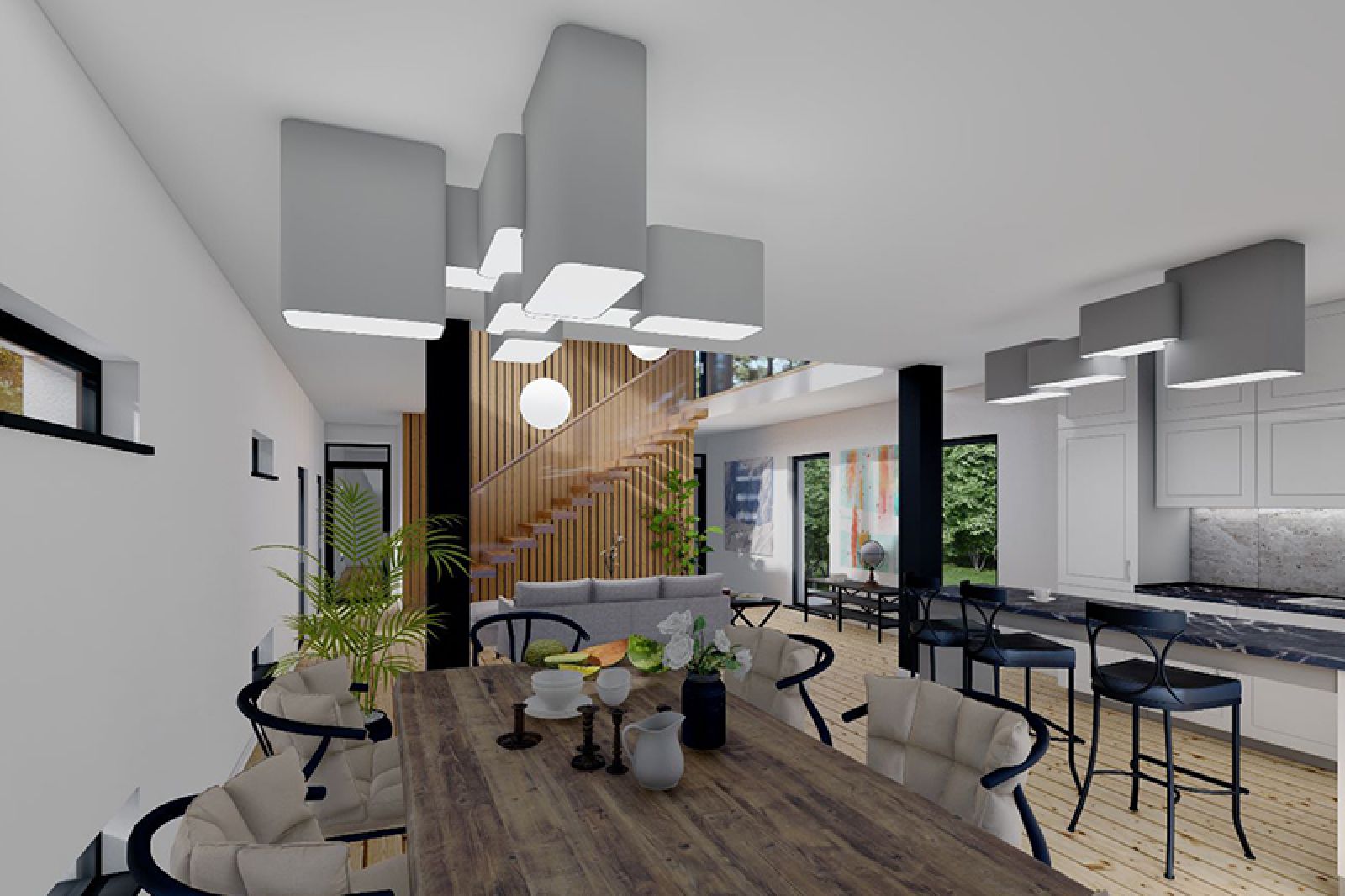 The architectural solution proposes a spatial connection between the existing ground floor and the new upper floor, providing natural lighting for the entire daytime area. The visual connection between the two floors creates a continuous, unified space.