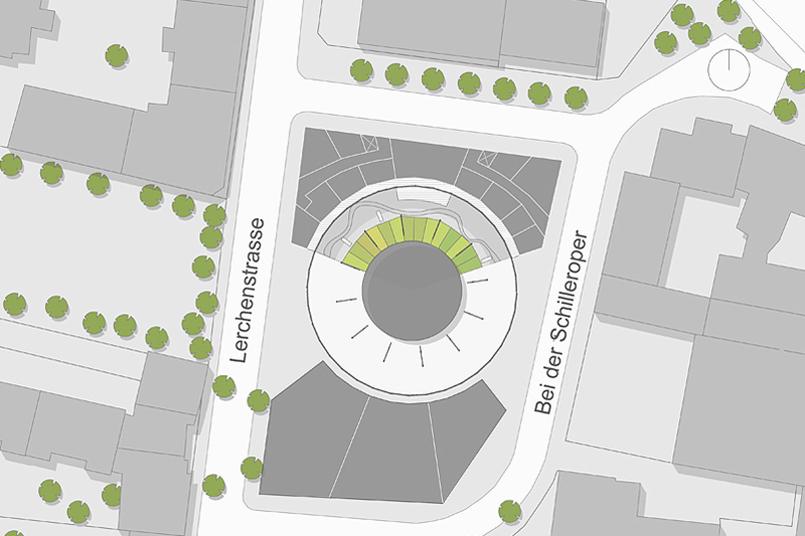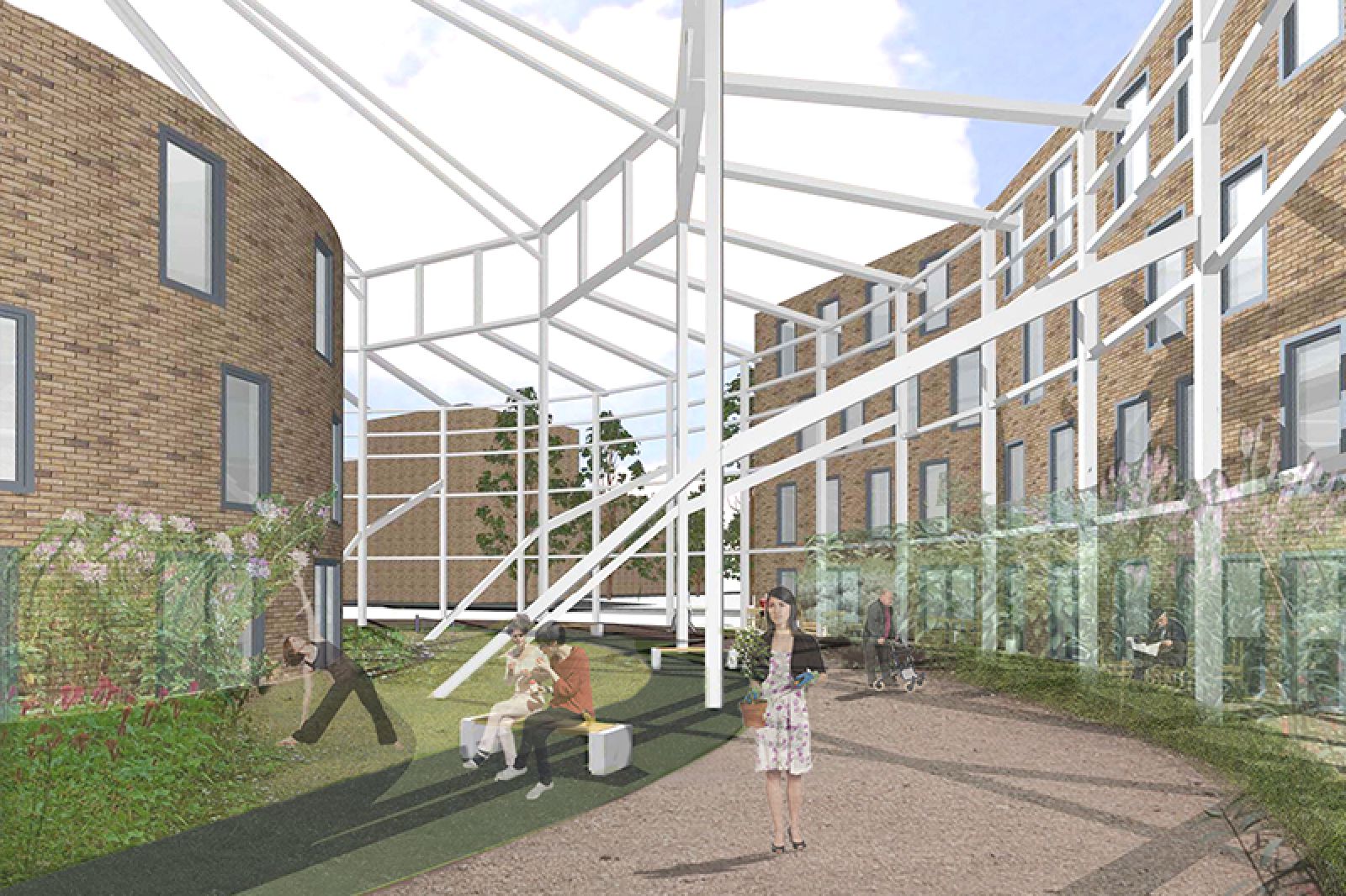 To the north, a four-story residential structure with social housing and living projects for senior citizens could be built, whereas in the south, a building could accommodate small-scale businesses, public uses and alternative housing formats. These buildings should be designed to conform with the eaves height of the existing steel structure, which, according to the residents' vision, could be used as a freestanding and green outdoor space that remains the centre of the area. In the core of the structure, a three-story edifice could be established to house numerous community services.
